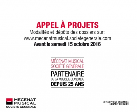 Mécénat Musical Société Générale soutient depuis 25 ans la musique classique instrumentale et vocale, du répertoire médiéval à la musique d'aujourd'hui. Vous êtes musicien professionnel ? Vous avez un ensemble et un projet pour 2016 ou 2017 et vous cherchez une aide financière ? C'est le moment de vous lancer : avant samedi 15 octobre 2016 déposez votre dossier via le site web de Mécénat Musical Société Générale !