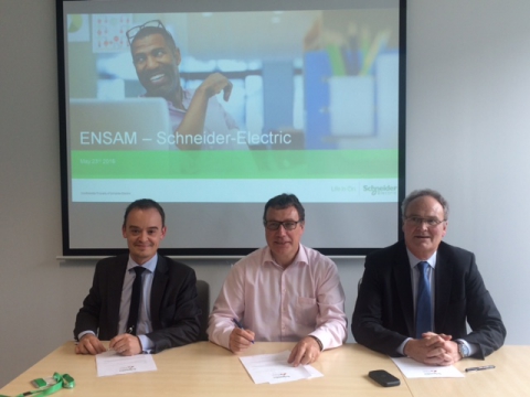 La signature a eu lieu au siège de Schneider Electric à Rueil Malmaison, en présence de Michel Delage SVP Global Supply Chain Europe Middle East & Africa, Romain Serratore, VP Logistique, Sylvie Deguil, Responsable de la Marque Employeur France et Michel Brissé, Directeur Production Industrielle à la retraite.